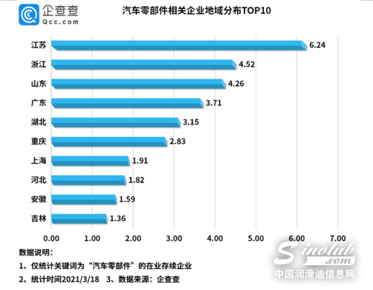 企查查数据显示,目前我国共有41.6万家汽车零部件相关企业,2020年相关企业注册量达9.62万家,同比增长56%, 2021年截至目前新增2.5万家。从地区分布来看,江苏省以6.24万家企业位居第一,浙江、山东分列二三名。