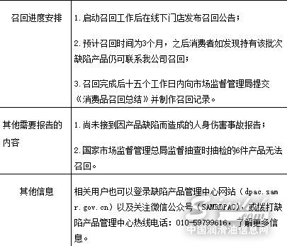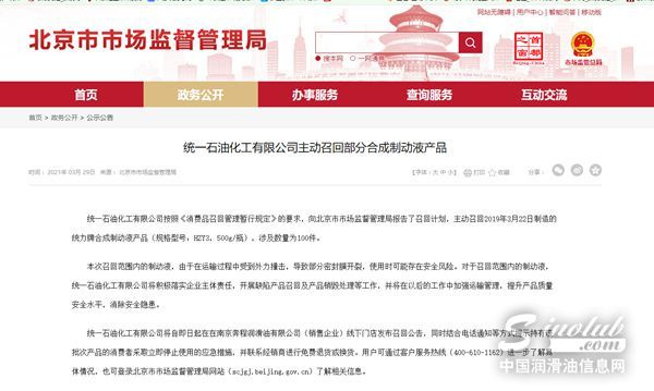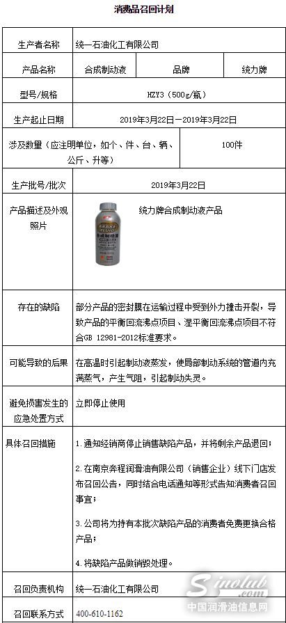 据北京市市场监督管理局网站消息,统一石油化工有限公司(以下简称“统一石化”)按照《消费品召回管理暂行规定》的要求,向北京市市场监督管理局报告了召回计划,主动召回2019年3月22日制造的统力牌合成制动液产品(规格型号:HZY3,500g/瓶),涉及数量为100件。