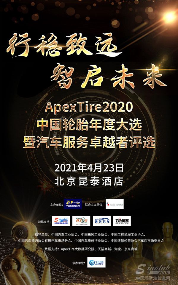 2021年4月23日在北京AMR展会期间举行颁奖盛典,发布LubTop2020中国润滑油行业年度总评榜榜单。基于用户信赖发现卓越品牌、基于体验数据彰显卓越品质的轮胎界“年度奥斯卡”“ApexTire2020中国轮胎年度大选暨汽车服务卓越者评选”(简称ApexTire2020年度大选)榜单将同期发布,参会的数十万汽车产业链行业人士将共同见证行业的发展和辉煌,王者荣耀彰显全球。