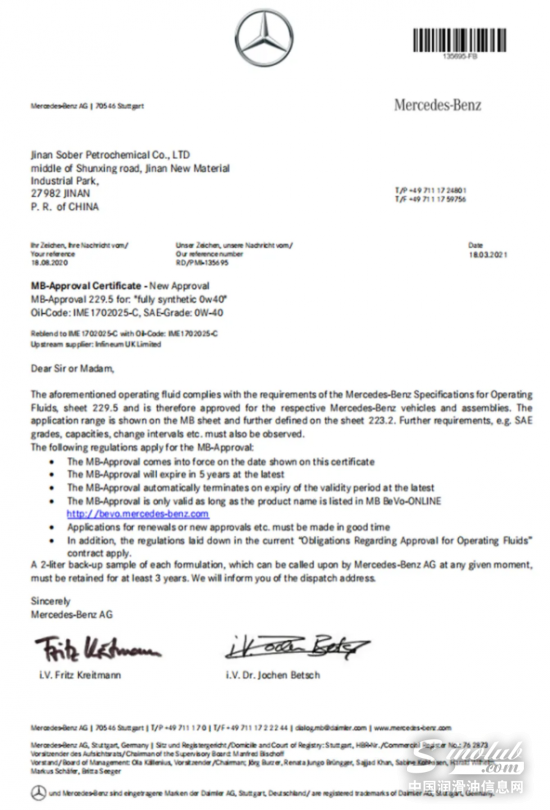 近日,德国奔驰公司认证赛邦润滑油产品“fuIIy synthetic 0W-40”系列产品通过MB229.5的技术标准!这是继赛邦润滑油通过沃尔沃车厂认证后,又一新的技术突破,再次验证赛邦润滑油卓越品质和可靠性能!