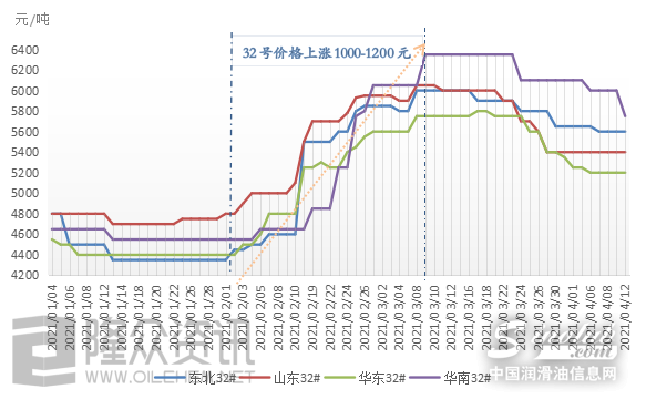 隆众数据显示,第一季度基础油价格处于大势上涨的走势。主要受国际油价上涨支撑,带动原料成本水涨船高。其次继续受进口资源量紧缺支撑,国内资源供应有限,炼厂库存低位,带动国内资源销售。第一季度末,价格开始出现高位下跌,下游用户对于高价资源基本是采取刚需采购,库存维持在低位运行,润滑油品牌价格上涨后,终端购买力下降,需求淡季也反应比往年提前到来。