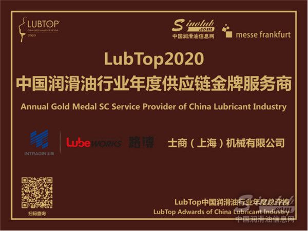 lubeworks(路博)是士商(上海)机械有限公司旗下的流体输送品牌,专注于润滑油加注20余年。在同期举办的LubTop2020 中国润滑油行业年度总评榜颁奖盛典上,士商(上海)机械有限公司以以好口碑、高品质、优服务,荣膺“LubTop2020 中国润滑油行业年度供应链金牌服务商”。本次获奖是对公司品牌力和服务力的双重认可,也更加坚定了士商不忘深耕行业,以稳定可靠的产品、接地气的服务体验,助推润滑油行业的高质量发展的决心和信心。面向未来,士商也将与时俱进,砥砺前行,为行业伙伴带来更具价值的产品解决方案!