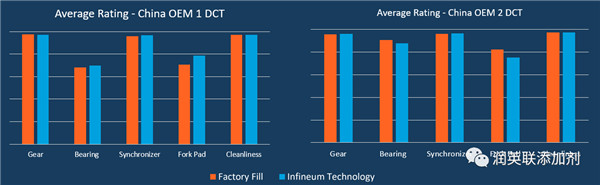 同时在中国及德国进行了相关的行车试验。行车试验采用了10辆装备国内外主流新型DCT变速箱(包含油冷混动变速箱、采用超低粘度油液的变速箱)的车辆,道路行驶10万公里,在试验结束后,由美国西南研究院和德国ISP实验室进行变速箱拆解及评分。通过评分结果,进一步验证了润英联新一代混动DCTF添加剂技术可提供优秀的硬件保护,性能表现与车厂初装油相似。
