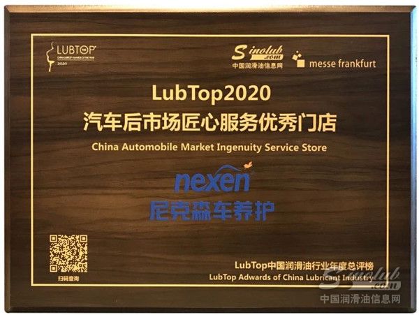 尼克森车养护荣获“LubTop2020汽车后市场匠心服务优秀门店”