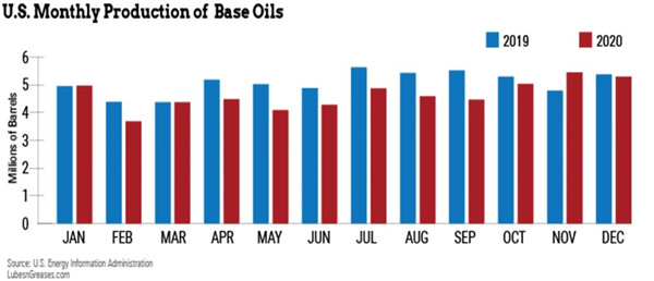 艾姆斯说:“2020年10月和11月基础油产量激增,主要是Excel Paralubes和Motiva都从飓风引起的停工中恢复过来。此外,炼油利用率普遍提高,反映出燃料需求有所增加。那将使额外的VGO可用于基础油。当然,大多数维护工作已经完成。”