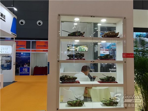 映入眼帘的“中兵之星“四个大字,提醒着我们来到了中国兵器工业集团盘锦北方沥青股份有限公司的展位,这是一家研发生产全系列润滑油及润滑油基础油、全系列道路石油沥青为主营业务的石油化工企业,是兵器工业集团化工战略板块的重要组成部分。本次参展,北方沥青携旗下汽机油、柴机油、工业油等多款拳头产品向行业展示了“军工品制,中国质造”。