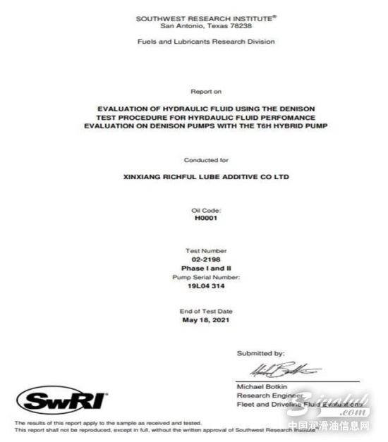 2021年5月28日上午, 美国西南研究院(SwRI)给瑞丰新材发来正式检测报告,确认其送检的高压抗磨液压油复合剂以0.8%的剂量通过Denison T6H20C台架试验。