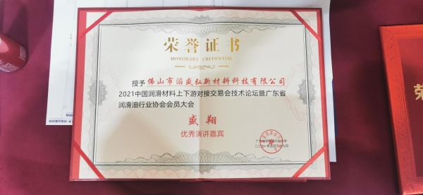 接着,会议举行了颁奖仪式,佛山市滔盛弘新材料科技有限公司当选广东省润滑油行业协会副会长单位,另外还荣获了“广东省润滑油行业协会第一届优秀会员单位”,盛翔先生的演讲也得到肯定,获得了“优秀演讲嘉宾”。