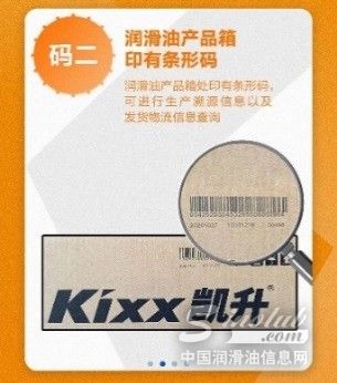 防伪鉴定功能:每一个正品Kixx凯升润滑油的瓶盖上都贴有小圆标,揭开小圆标后,标签背面均印有“真伪查询”二维码。消费者只需使用微信“扫一扫”功能扫描小圆标背面的真伪查询二维码,即可查询产品真伪。