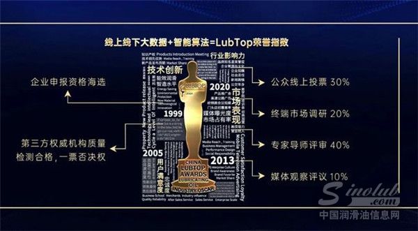 评选活动以技术创新、市场表现、用户满意度、行业影响力等四大维度为品牌核心评价体系,持续创新活动模式,发现好产品,彰显好品牌。并在企业申报资格海选、第三方权威机构质量检测结果(一票否决权)基础上,通过线上用户投票(占比30%)、专业市场调研(占比20%)、专家导师团评审(占比40%)、媒体观察评议(占比 10%)流程,最终以线上线下大数据+智能算法产生LubTop品牌荣誉指数,确定LubTop2020中国润滑油行业年度总评榜榜单。