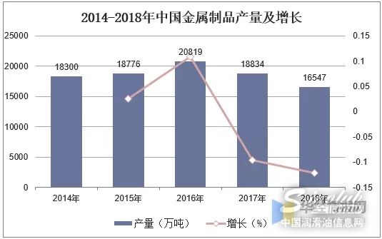金属制品产量方面,2018年中国金属制品产量为16547万吨,同比降低12.1%。