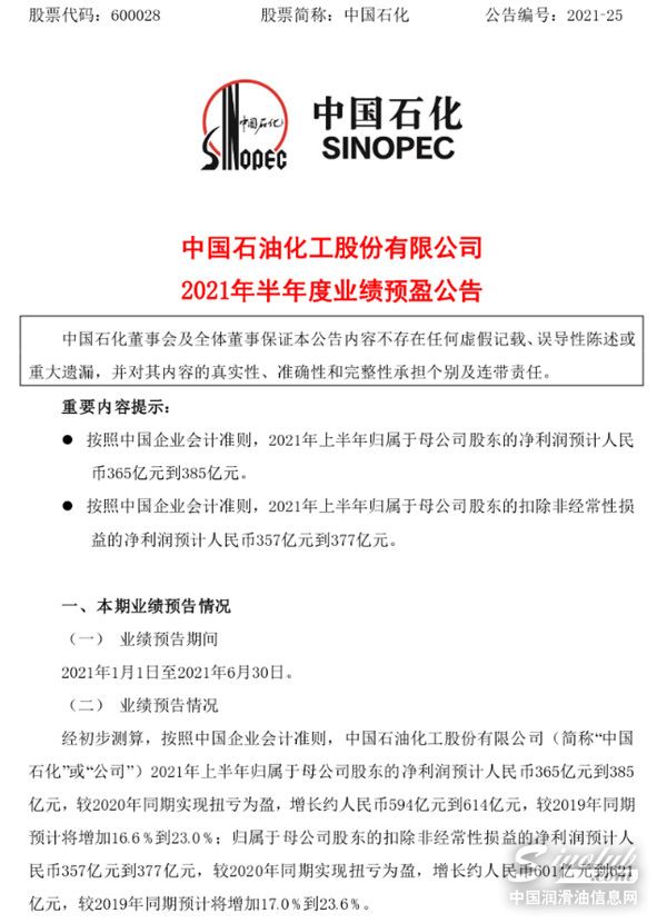 中国石油化工股份有限公司2021年半年度业绩预盈公告