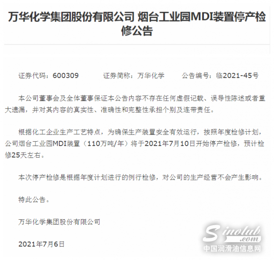 万华化学7月6日发布停产公告,宣布将于7月10日开始停产检修,预计检修25天。