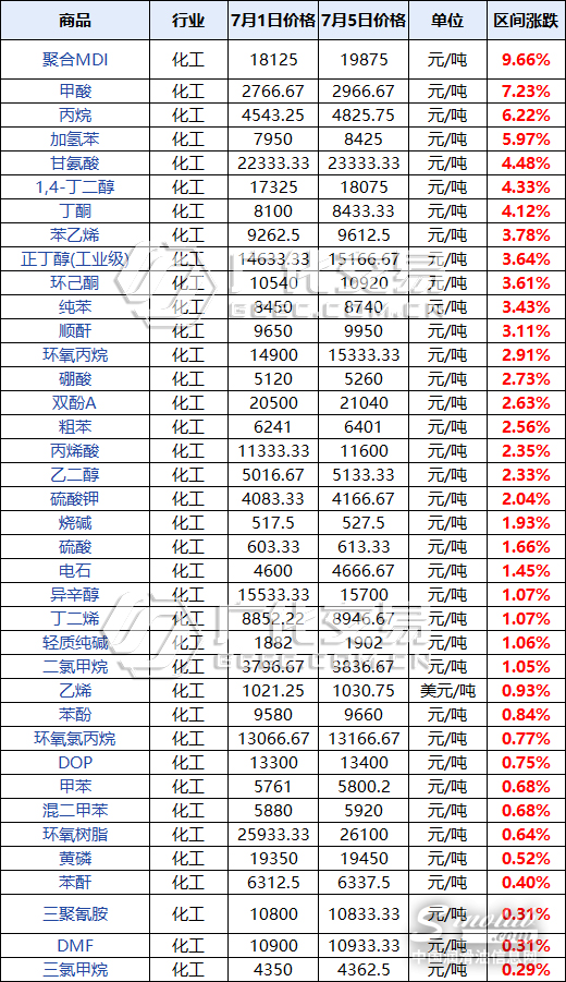 据近5日化工大宗榜显示,共有38种化工品处于上涨状态。其中涨幅前三为:聚合MDI(9.66%)、甲酸(7.23%)、丙烷(6.22%)。