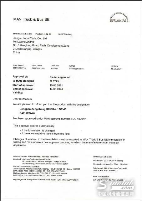 近日,龙蟠赠程CK-4 10W-40柴油机油,正式获得由世界知名重型卡车发动机制造厂商——德国MAN(曼)公司颁发的产品认证证书。该项证书的获得,说明了龙蟠赠程产品的各项性能指标,能够充分满足国六时代高端重型车辆的养护需求。这是龙蟠润滑油进军高端柴机油市场之路上,获得的又一国际权威认可。