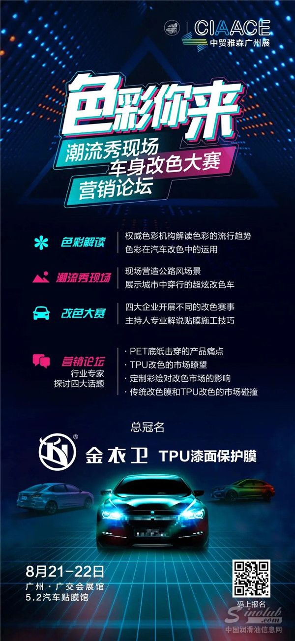 改色膜板块将会与同期活动联合展示产品的新潮流、新技术、新产品,权威色彩机构解读色彩的潮流趋势和在车身改色上的应用,改色膜大赛展示不同产品的贴膜技巧,营销论坛探讨产品的市场潜力和发展。
