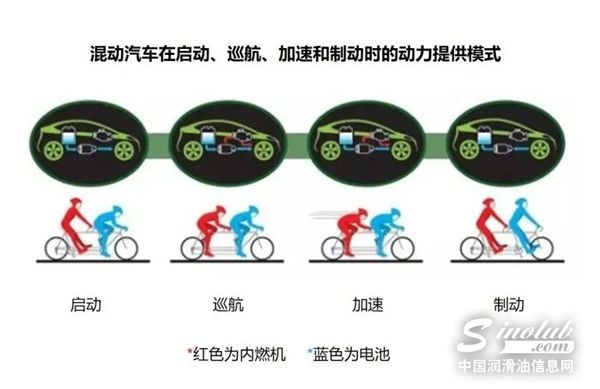 混合动力车辆在启动和低速时都是由电动机进行驱动,当车辆速度提升上来后,发动机进行工作。发动机启动后,会进行高速运转,但发动机刚启动时润滑油温度较低(环境温度),因而需要使用具有优异的抗磨和流动特性的润滑油。