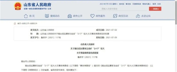据山东省政府网站消息,山东省人民政府发布关于烟台招远曹家洼金矿“2·17”较大火灾事故调查报告的批复。2021年2月17日6时许,山东烟台招远市夏甸镇曹家洼金矿在设备检修时发生火灾。截至2月17日17时,井下搜救工作结束。此次事故共造成6人遇难,4人成功升井。