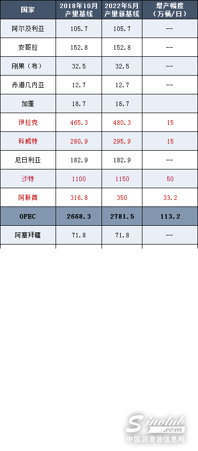 3、将部分产油国产量基线上调,自2022年5月起生效。阿联酋的新基线为350万桶/日,较此前增加33.2万桶/日,同时将伊拉克、科威特产量基线分别提高15万桶/日,沙特、俄罗斯产量基线各提高50万桶/日。