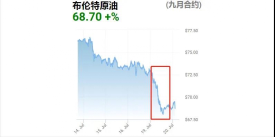 受此影响,国际原油期货价格19日大跌。截至当天收盘,纽约商品交易所8月交货的轻质原油(WTI)期货价格下跌5.39美元,收于每桶66.42美元,跌幅为7.51%,是去年9月8日以来的单日最大跌幅;9月交货的伦敦布伦特原油(Brent)期货价格下跌4.97美元,收于每桶68.62美元,跌幅为6.75%,是今年3月18日以来的单日最大跌幅。