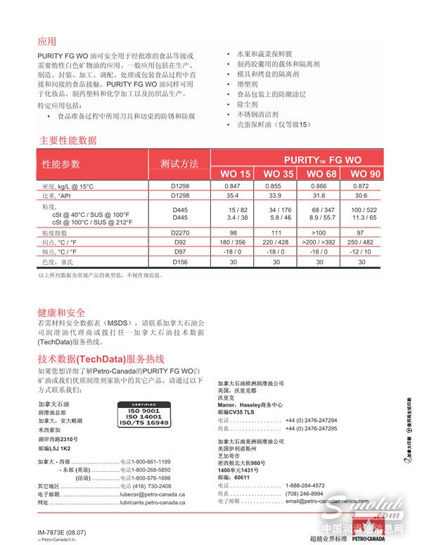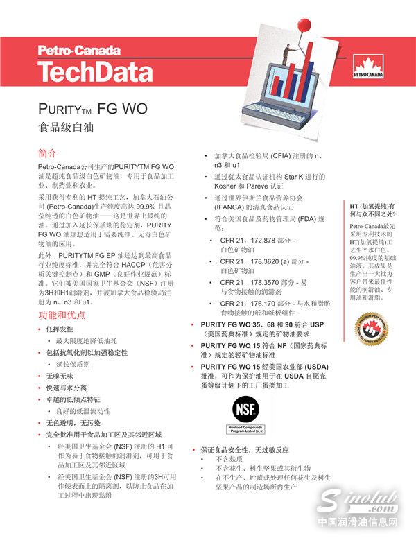 加拿大石油是全球最大的食品级白矿油制造商之一,品牌HT专利技术能够提纯出高达99.9%纯度的食品级白矿油PURITY FG WO,这也是目前全球纯度最高的白矿油之一。