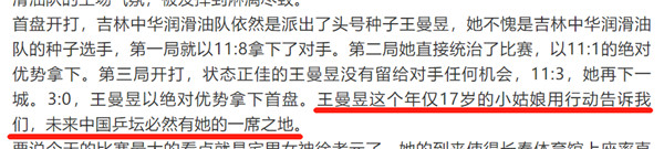 王曼昱——曾是我们中华润滑油冠名赞助的吉林女乒(中润华油队)队员。一起走过的那些岁月里,我们为她和她所在的队伍加油欢呼,摇旗呐喊。
