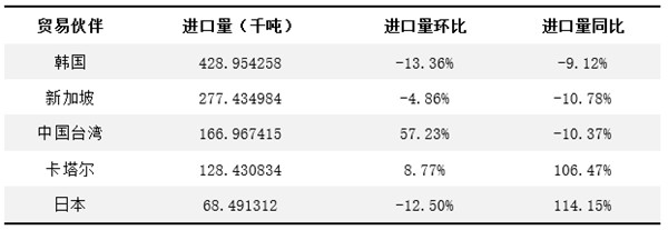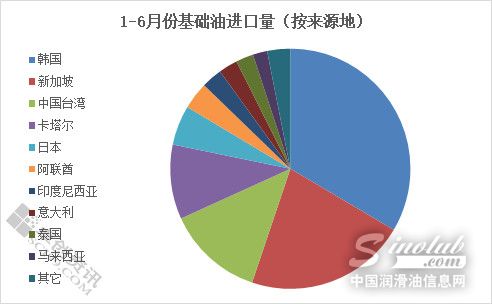 从进口来源国(地区)来看,韩国、新加坡、中国台湾为1-6月进口量的前三位。其中,自韩国进口基础油在42.9万吨,占进口总量的33.5%,同比下跌9.12%,自新加坡进口的基础油达27.7万吨,占进口总量的21.67%,同比下跌10.78%;自中国台湾进口基础油达16.7万吨,占进口总量的13.04%,同比下跌10.37%。2021年,卡塔尔三类基础油进口量大幅增涨,涨幅在106.47%。