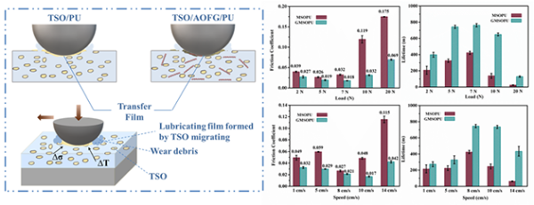 此外,研究还通过氧化石墨烯(GO)表面的重氮化反应、改性GO的锚固作用、聚氨酯的原位聚合实现了基质强化(图2),材料的交联密度及致密性有效提升,使复合涂层的摩擦系数降低90%,磨损率降低一个数量级,且摩擦寿命延长5倍左右。研究将强化基体与液相硅油复合,使三元复合涂层的摩擦系数进一步降低30%,寿命延长1.35倍。与未强化基体的复合涂层相比,摩擦系数降低60%,磨损寿命最高提升5倍,且这一提升效果在高载和高速下更明显(如图3)。另外,由于硅油的疏水性及其在涂层基体中的毛细管阻力,复合涂层的耐腐蚀性也得到有效提升。