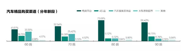 近些年,随着电商平台在汽车后市场服务的强势介入,汽车精品迎来了更为便捷价廉的购买渠道。调查显示,64%的受访者选择在电商平台选购汽车精品,其中以80后、90后占比最高,而对于60后的“老司机”来说,汽车服务实体店是除电商平台以外的最重要购买渠道,占比达33.33%。