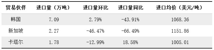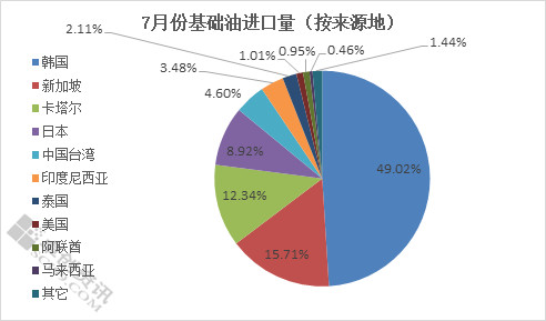 从进口来源国(地区)来看,韩国、新加坡、卡塔尔为7月进口量的前三位。其中,自韩国进口基础油在7.09万吨,占7月进口总量的49.02%,环比上涨2.79%;自新加坡进口的基础油达2.27万吨,占7月进口总量的15.71%,环比下跌46.47%;自卡塔尔进口基础油达1.78吨,占5月进口总量的12.34%,环比下跌12.99%。而自台湾省进口的基础油受其检修计划影响,已连续两月明显减少,7月进口量仅为0.67万吨,环比下跌47.02%。