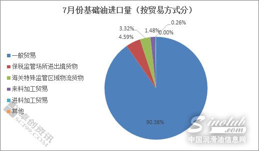 从贸易方式来看,7月份国内进口基础油以一般贸易居首,保税监管场所进出境货物及海关特殊监管区域物流货物分别排名二、三位。据卓创资讯数据统计,7月份一般贸易模式进口基础油数量在13.07万吨,占总进口量的90.38%;保税监管场所进出境货物0.66万吨,占进口总量的4.59%;海关特殊监管区域物流货物0.48万吨,占比3.32%。