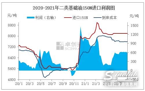 从进口利润来看,7月份基础油进口利润趋稳运行,外盘及国内售价变化不大,利润值受汇率影响小幅波动为主。据卓创资讯数据统计,7月进口150N理论到岸成本均价在7602元/吨,环比回落0.68%,进口150N理论利润空间在597.93元/吨,环比上涨9.71%。8月份来看,由于7-8月台塑检修,进口150N供应数量减少,外盘及国内售价相对坚挺,利润空间或维持平稳运行,进口150N理论盈利空间预计在611元/吨左右。