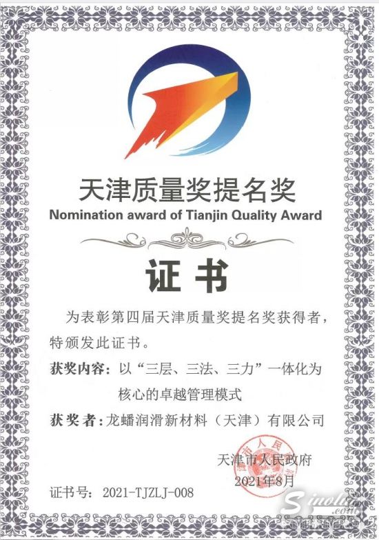 9月1日,天津市政府举行2021年“质量月”活动启动暨第四届天津质量奖颁奖仪式。龙蟠科技股份有限公司旗下全资子公司——龙蟠润滑新材料(天津)有限公司获得第四届天津市质量奖提名奖。