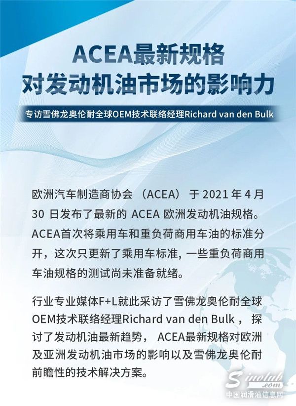 编者按日前,欧洲汽车制造商协会(ACEA)发布最新的欧洲发动机油规格。作为全球四大添加剂公司之一,雪佛龙奥伦耐的全球OEM技术联络经理接受行业媒体专访,探讨了发动机油最新趋势,ACEA最新规格对市场的影响以及前瞻性的技术解决方案。关于ACE...