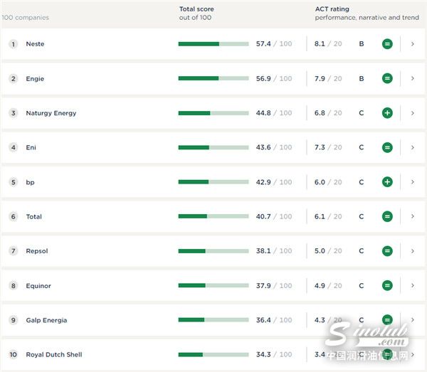 值得注意的是,埃尼集团(Eni)、英国石油(BP)、道达尔(Total)、挪威国家石油公司(Equinor)和壳牌(Shell)等欧洲巨头占据了前十名中的多数席位。芬兰可持续燃料和材料公司Neste位居榜首。排名第二的是法国公用事业公司Engie,该公司设定了排放目标,目标是每年增加4千兆瓦的可再生能源。雷普索尔(Repsol)和盖尔普能源公司(Galp Energia)也进入了前十名,所有表现最好的公司都是欧洲公司。