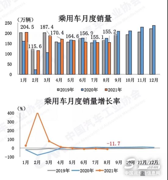 1-8月,乘用车产销分别完成1289.1万辆和1311.2万辆,同比分别增长15.2%和16.0%,增幅比1-7月继续回落4.9和5.2个百分点。与2019年同期相比,产销同比分别下降2.5%和1.7%,降幅比1-7月分别扩大1.3和0.7个百分点。