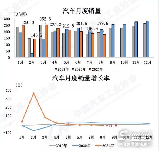 1-8月,汽车产销分别完成1616.6万辆和1655.6万辆,同比分别增长11.9%和13.7%,增幅比1-7月继续回落5.3和5.6个百分点。与2019年同期相比,产销同比分别增长1.3%和2.7%,产销量增幅比1-7月分别回落2.1和1.5个百分点。