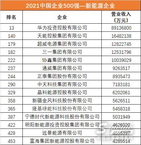 此次共15家新能源企业上榜,其中华为、天能集团、超威电源、三一集团、协鑫集团5家企业营收超过千亿。华为以超8千亿的营收位居第一。