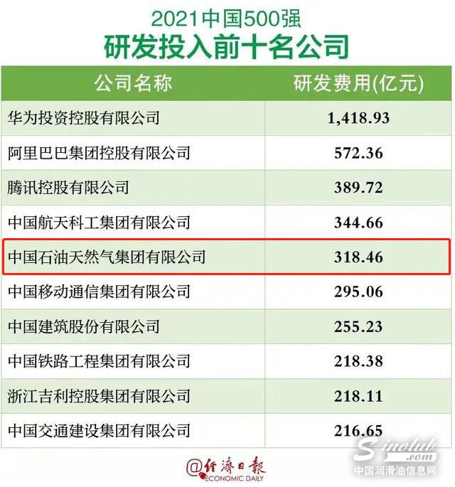 值得关注的是,2021中国500强研发投入前十名公司中,中国石油以318.46亿元排名第5。
