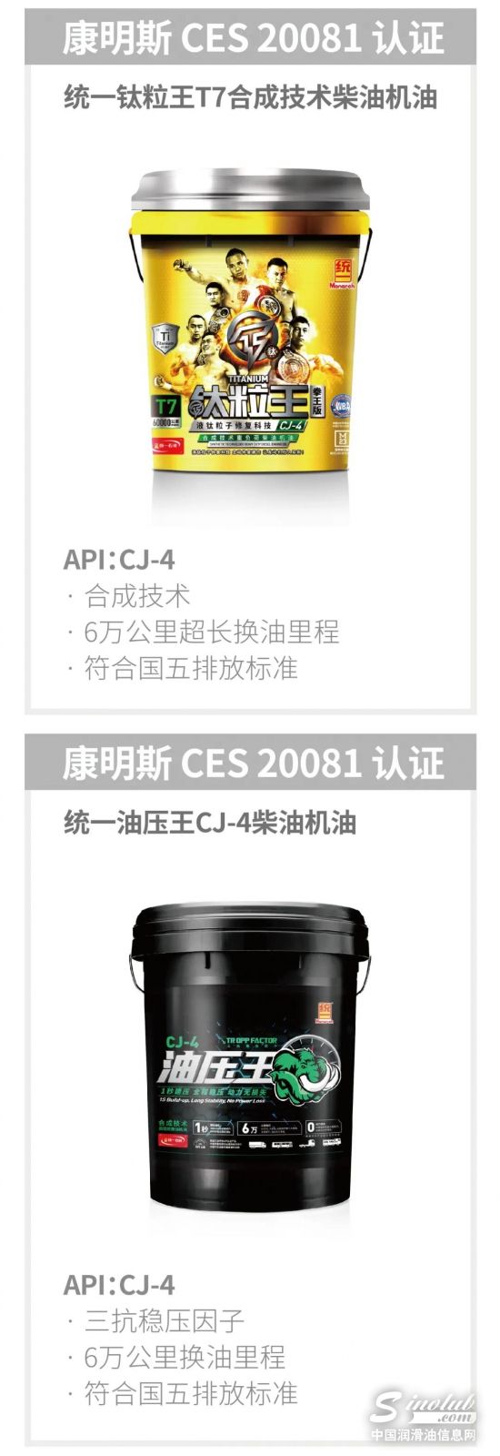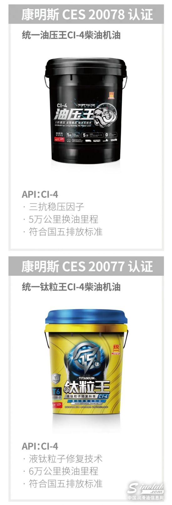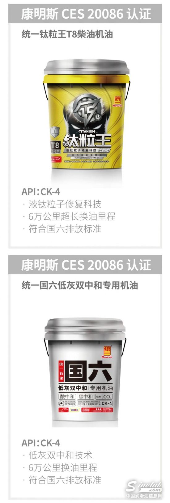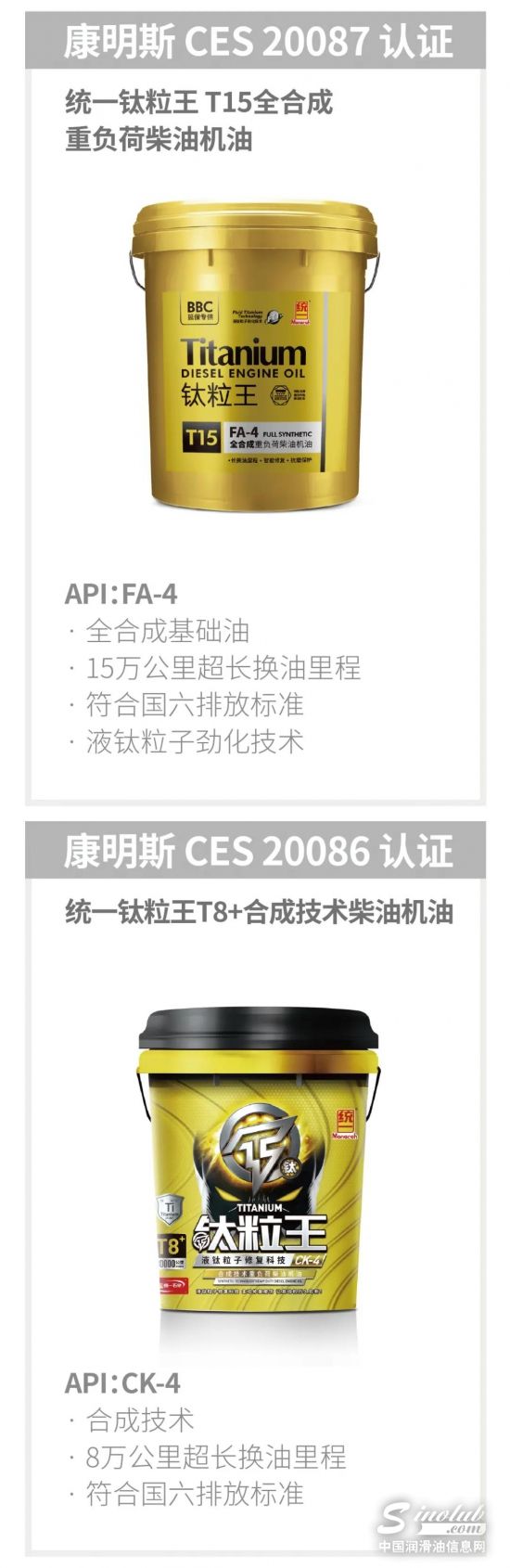 统一钛粒王T8+合成技术柴油机油、统一钛粒王T8柴油机油以及统一钛粒王T7合成技术柴油机油成功获得康明斯6项认证。