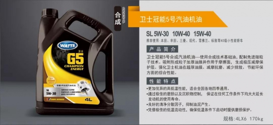 卫士冠能5号合成汽油机油 — 使用合成技术基础油,配制先进微粒子技术。吸附形成粒子加厚油膜并作用于摩擦面,生成极压减摩保护层。强化卫士机油在超厚油膜、减摩抗磨、减少排放等综合性能。