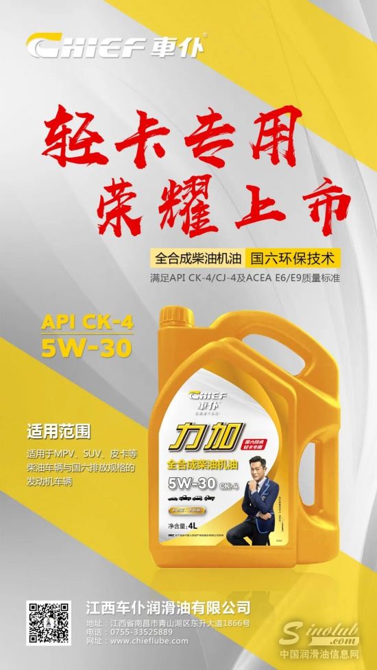 针对新型国六轻卡/皮卡车辆养护,车仆润滑油隆重推出力加 CK-4 5W-30 全合成柴油机油,采用国六环保技术,符合API CK-4/CJ-4和ACEA E6/E9等技术标准,是新型国六轻卡/皮卡养护专属油品。