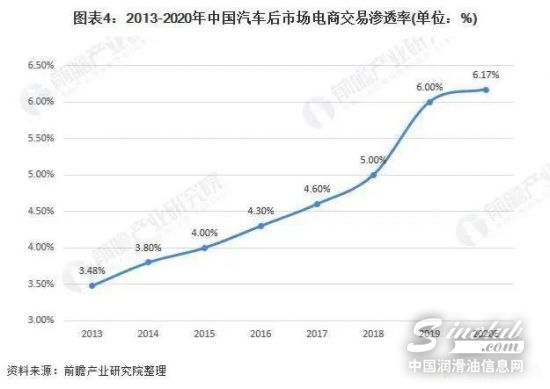从汽车后市场的电商渗透率变化情况来看,2013-2019年我国汽车后市场的电商渗透率呈现增长趋势,但是比例仍然较低,2019年我国汽车后市场电商渗透率为6.00%,预计2020年渗透率为6.17%。