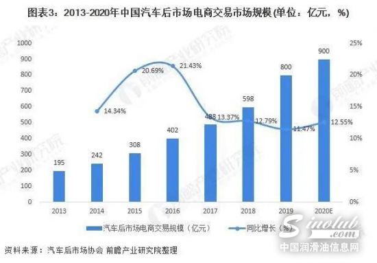 根据统计,2013-2019年我国汽车后市场电商交易规模呈现连续增长趋势,2019年我国汽车后市场电商交易规模约为800亿元,同比增长11.47%,预计2020年交易规模增长到900亿元。