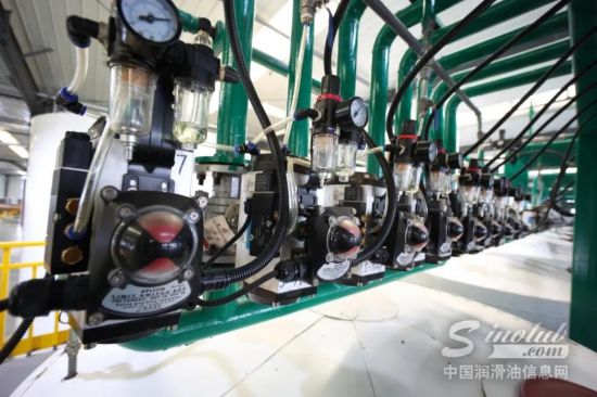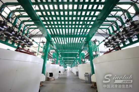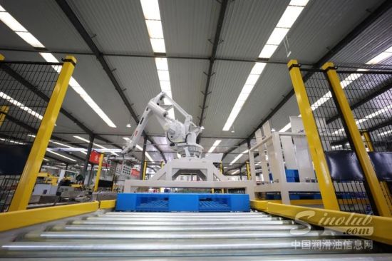 生产车间内所有生产和操作,在信息化、自动化、智能化设备的运转下实现大规模生产,以人工智能技术为核心的系统自动分配生产任务,并完成从润滑油基础油到全合成润滑油的调和工作,再由全自动生产线(全自动上桶机、全自动上称重式灌装机、全自动旋转式旋盖机、在线检重剔除、全自动跌落式装箱机、全自动封箱机、ABB机器人码垛机)安排生产工作,可以更加精准的确保产品的质量和提高生产力,降低供货周期。
