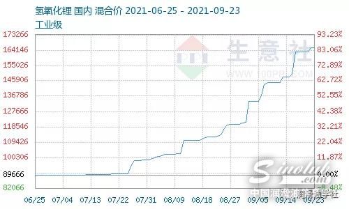 但,如果仔细看那几家的涨价函,就会发现,这次其实涨价的就只有1个产品,就是润滑脂,也就是黄油。原因,涨价函里也说了,很简单。就是制作润滑脂的原料氢氧化锂的价格暴涨,按照他们的说法是涨价了300%,小编看了看,今年1月份的时候工业氢氧化锂的价格大约在53000/吨,从2月份开始,价格就开始爬坡,春节过后,价格就开始明显上涨,一路跳至73000-85000/吨,此后一路缓慢上涨,到6月底,大约涨至95000/吨。下半年,迎来更疯狂的市场,跳跃式价格上涨,到9月份已经涨到165000/吨,对比年初的53000,说涨了300%,还真不为过。