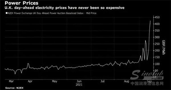 目前英国有超过37%的电力依赖天然气,在天然气价格迅速上涨的背景下,电力价格也迅速上涨,截止2021年9月,英国每兆瓦时电价已经涨到285英镑,在2020年9月份的时候,月度平均电价只有45英镑左右,相当于一年时间,英国的电价涨幅超过500%,而且还打破了从1999年到2021年的22年的历史记录。