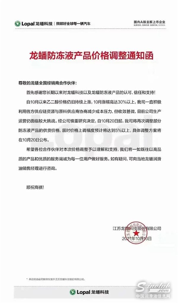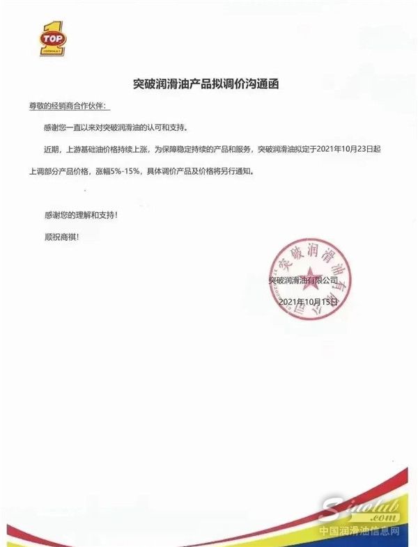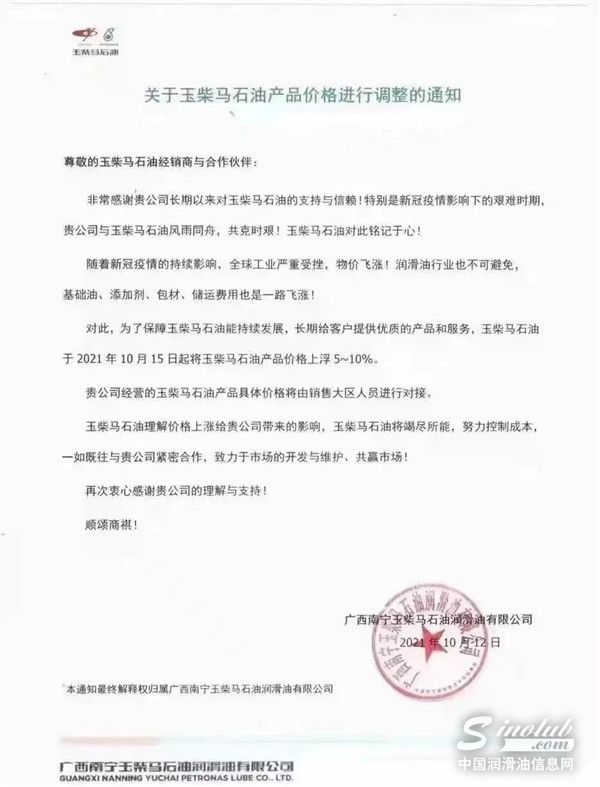据中国润滑油信息网从市场获悉,十一期间,多数润滑油工厂停工3天。随着国际油价持续刷新年内最高以及限产限电影响的持续发酵,部分原材料价格已涨至近几年最高点。原油价格的疯涨以及基础油价格的持续上涨大大拉动了工厂的看涨情绪,同时炼厂货源的紧张也带来了下游工厂的“抢货恐慌”,工厂多数积极备货。原料价格的快速上涨也开启了润滑油工厂成品的调价窗口,工厂纷纷发布调价信息。寒冬来临之前,10月新一轮润滑油涨价风暴来袭。