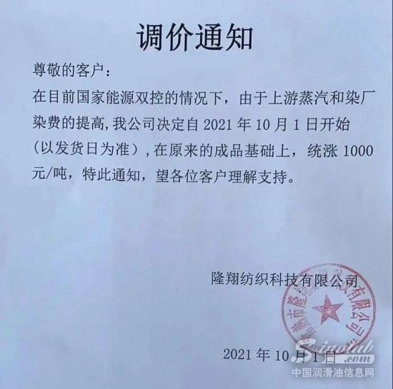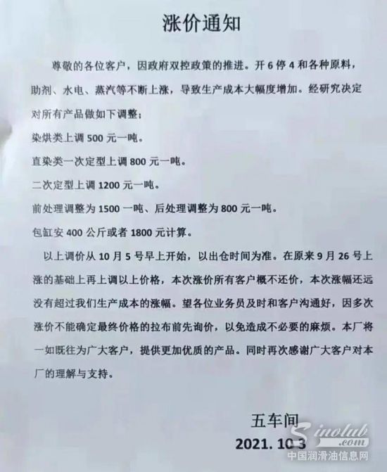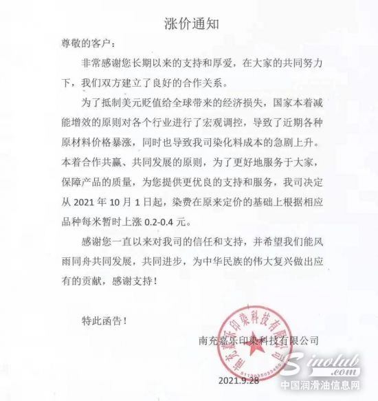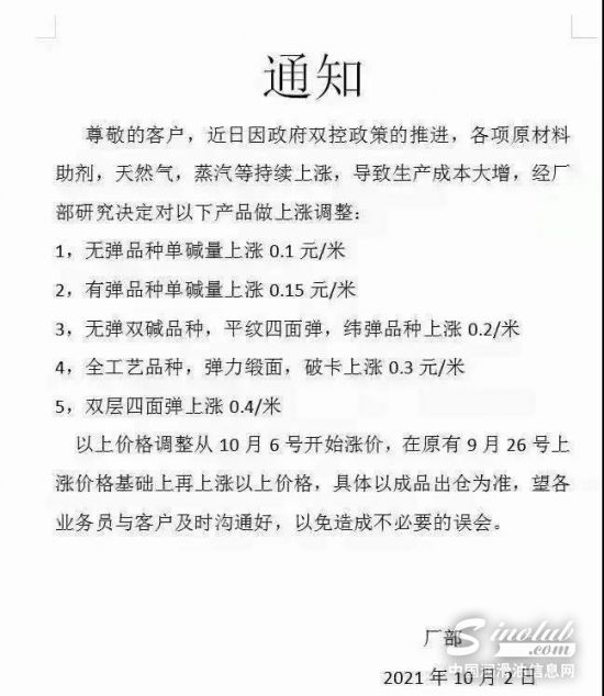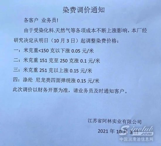 10月1号开始,第二波染费上涨扑面而来,有印染厂发布通知,全部产品加工费价格上调,下单前请先询价!