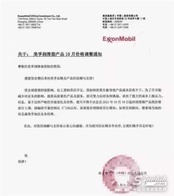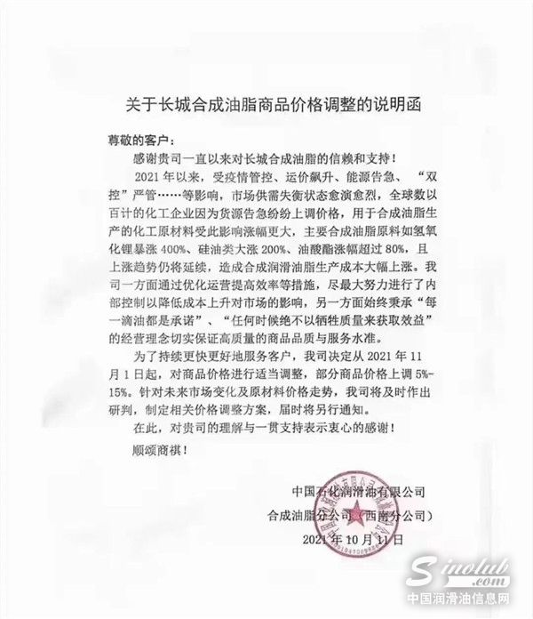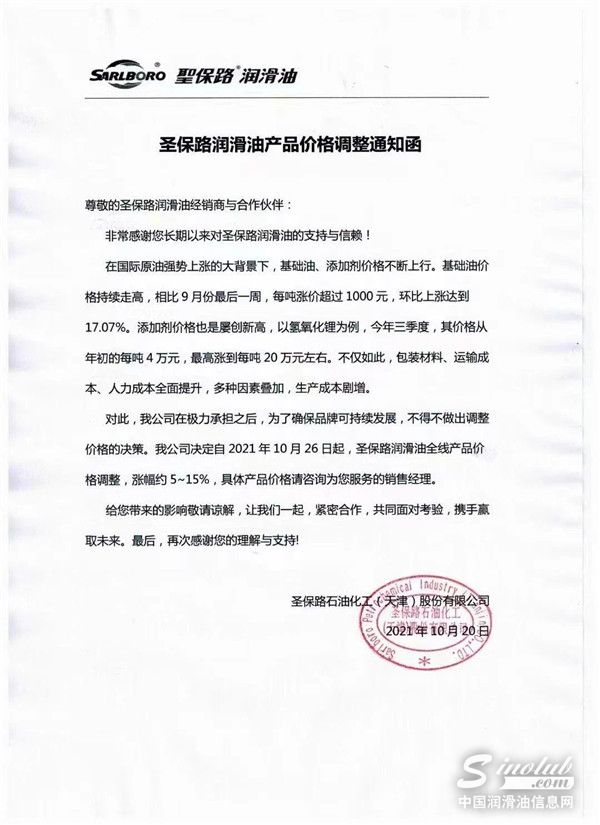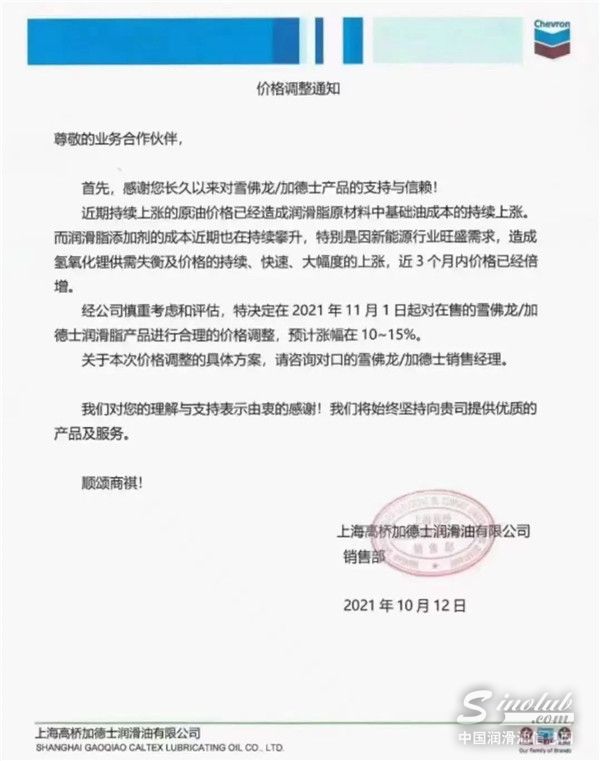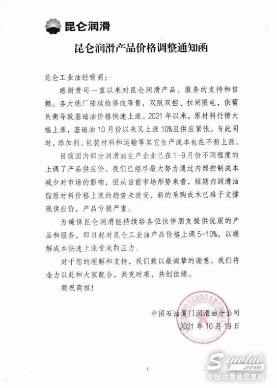 中国润滑油信息网(sinolub.com)从市场获悉,10月19日,中国石油天然气股份有限公司旗下成都润滑油分公司、厦门润滑油分公司发布昆仑润滑产品价格调整通知,通知函表示,“2021年四季度伊始,基础油价格呈大幅上扬态势,主要基础油品种价格上涨1000元/吨,主要包装规格包装物涨幅26%,从而导致润滑油产品成本快速上升。为了更好地服务客户和合作伙伴,尽可能减少对市场及业务的影响,我公司在承担、吸收上涨成本的同时,不得不对润滑产品做出价格调整”。“我公司将定于10月20日起,全线调整润滑油产品的销售价格,涨幅约10-15%”。